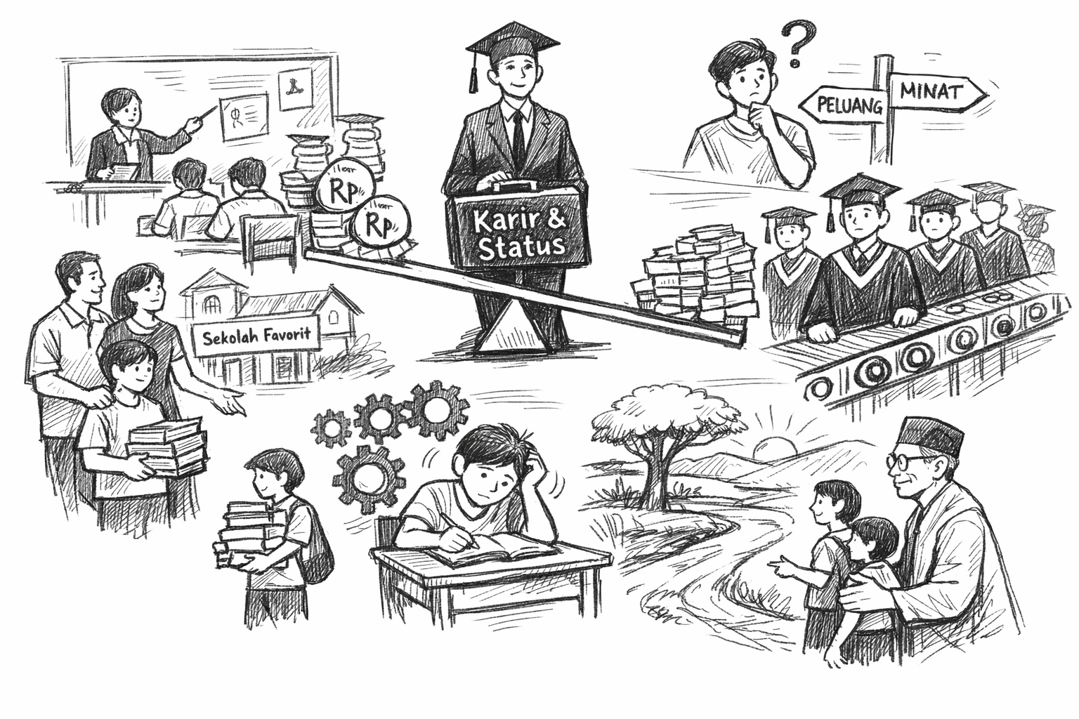 Ada kegelisahan yang belakangan ini sulit penulis abaikan. Ia tidak lahir dari satu peristiwa besar, melainkan dari pengamatan sehari-hari tentang bagaimana pendidikan dipahami dan dijalankan di tengah masyarakat kita dewasa ini. Pendidikan, yang sejatinya merupakan proses memanusiakan manusia, perlahan direduksi menjadi alat mobilitas sosial. Di tingkat keluarga, khususnya orang tua, pendidikan sering dimaknai melalui jalur yang dianggap paling aman: memilihkan sekolah yang baik agar anak kelak memperoleh pekerjaan yang baik. Niat ini tentu tidak keliru. Namun persoalan muncul ketika anak tidak lagi diperlakukan sebagai subjek yang memiliki potensi dan kecenderungan unik, melainkan sebagai objek yang harus disesuaikan dengan kebutuhan pasar.