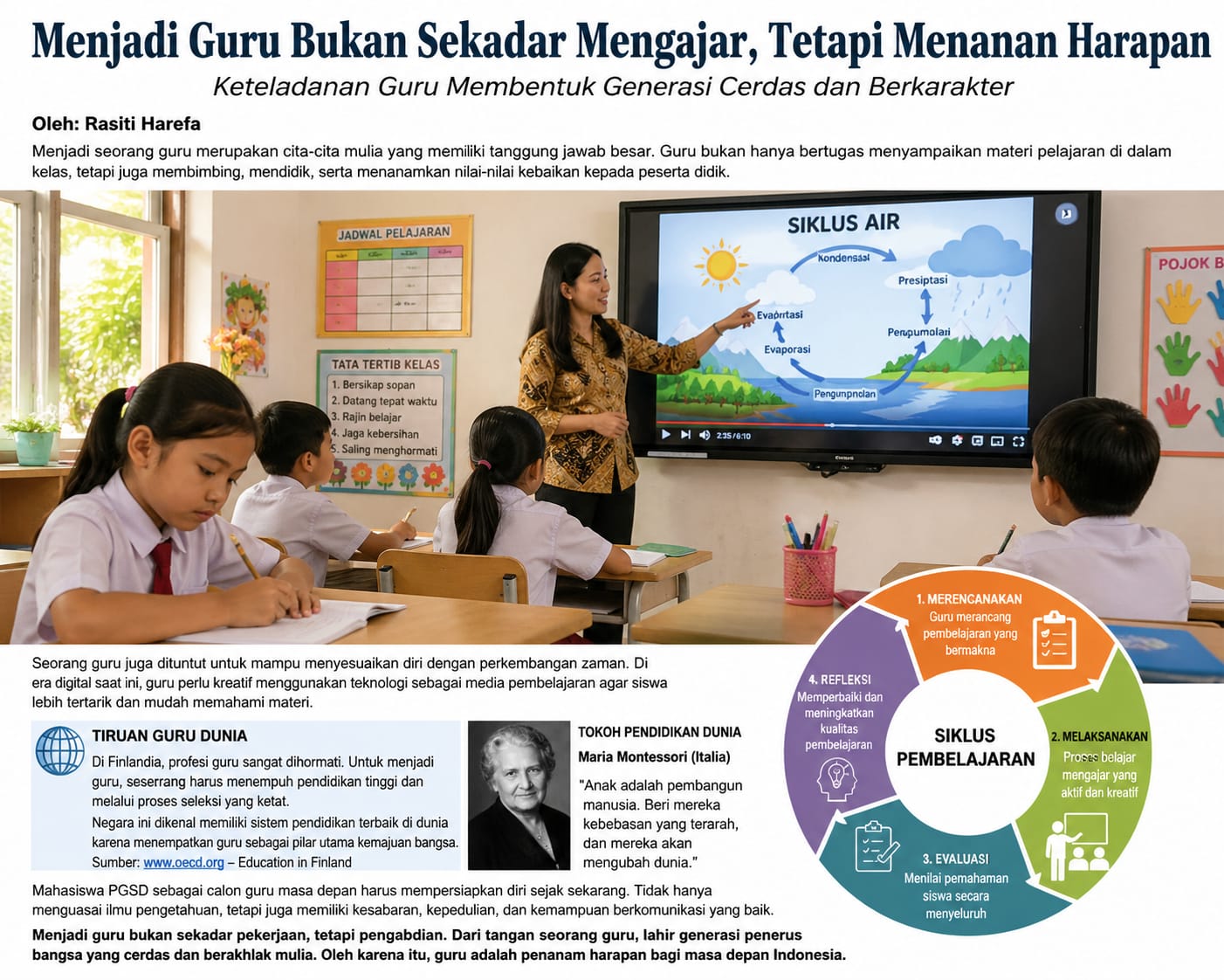 Menjadi seorang guru merupakan cita-cita mulia yang memiliki tanggung jawab besar. Guru bukan hanya bertugas menyampaikan materi pelajaran di dalam kelas, tetapi juga membimbing, mendidik, serta menanamkan nilai-nilai kebaikan kepada peserta didik. Guru adalah sosok yang mampu mengubah masa depan anak melalui ilmu dan keteladanan.