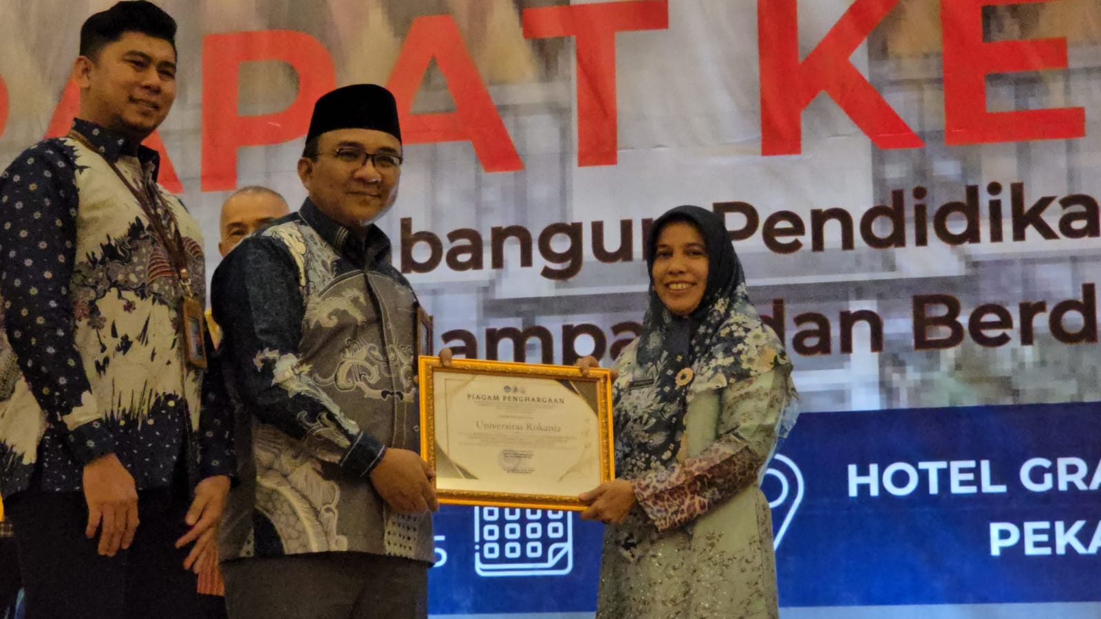 Penghargaan tersebut diterima langsung oleh Rektor Universitas Rokania, Dr. Desmelati, M.Sc, yang mewakili seluruh sivitas akademika. Piagam penghargaan diserahkan secara resmi oleh Kepala LLDIKTI Wilayah XVII, Dr. Nopriadi, M.Kes, sebagai bentuk apresiasi atas komitmen Universitas Rokania dalam menjaga mutu pelaporan data pendidikan tinggi secara konsisten, akurat, dan tepat waktu melalui sistem PDDIKTI.